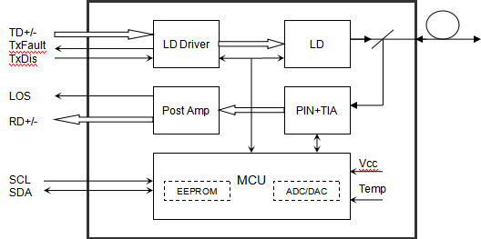 The transceiver consists of three sections: a DFB laser transmitter, a PIN photodiode integrated
